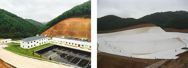 The MSW is filled with one layer of waste and one layer of cover soil alternately, and compacted by compactors so that the MSW could be stable through long-time physical, chemical and biological reactions. Landfill gases (e.g. CH4, CO2, N2,H2S), created by waste decomposition, exhaust through gas tubes buried in advance, which are collected and utilized as fuel or to generate power. The bottom of the landfill is waterproof in case of polluting the undergrounds water. The leachate is collected by collecting pipes and treated together.