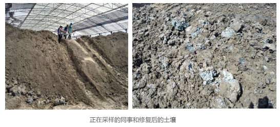 從室外到大棚,我們來到了土壤修復后的暫存區,烈日炎炎下的大棚溫度超過了40℃,大家站著身上都在淌著汗水,這時見到了正在采樣的同事,為了保障工程能夠保質、保量完成,他們不畏酷暑、不怕嚴寒、不怕臟、不怕累,數月吃住在工地,為了最干凈的環境,他們投入到了最臟的工作中去。